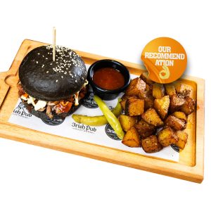 beef 150g / caramelized onion / cheddar cheese / pickles / pancetta / arugula / cherry tomato