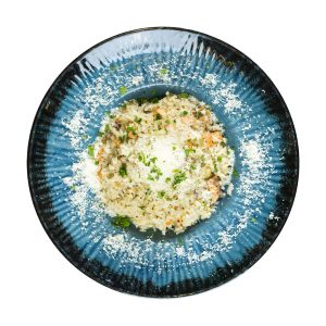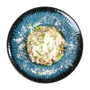 rice / smoked drumstick / mushrooms / garlic / red onion / white wine / butter / parmesan cheese / salt / pepper / chives